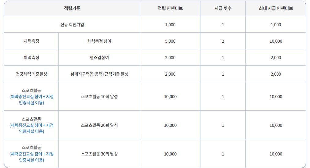 국민체력 100 스포츠활동 인센티브 적립 기준