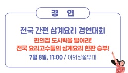 | 금산 삼계요리 쿠킹 클래스 | 요리전문가의 손길을 따라 배우는 우리집 건강요리 | 7월 7일 ~ 9일 (10시 ~ 18시) |