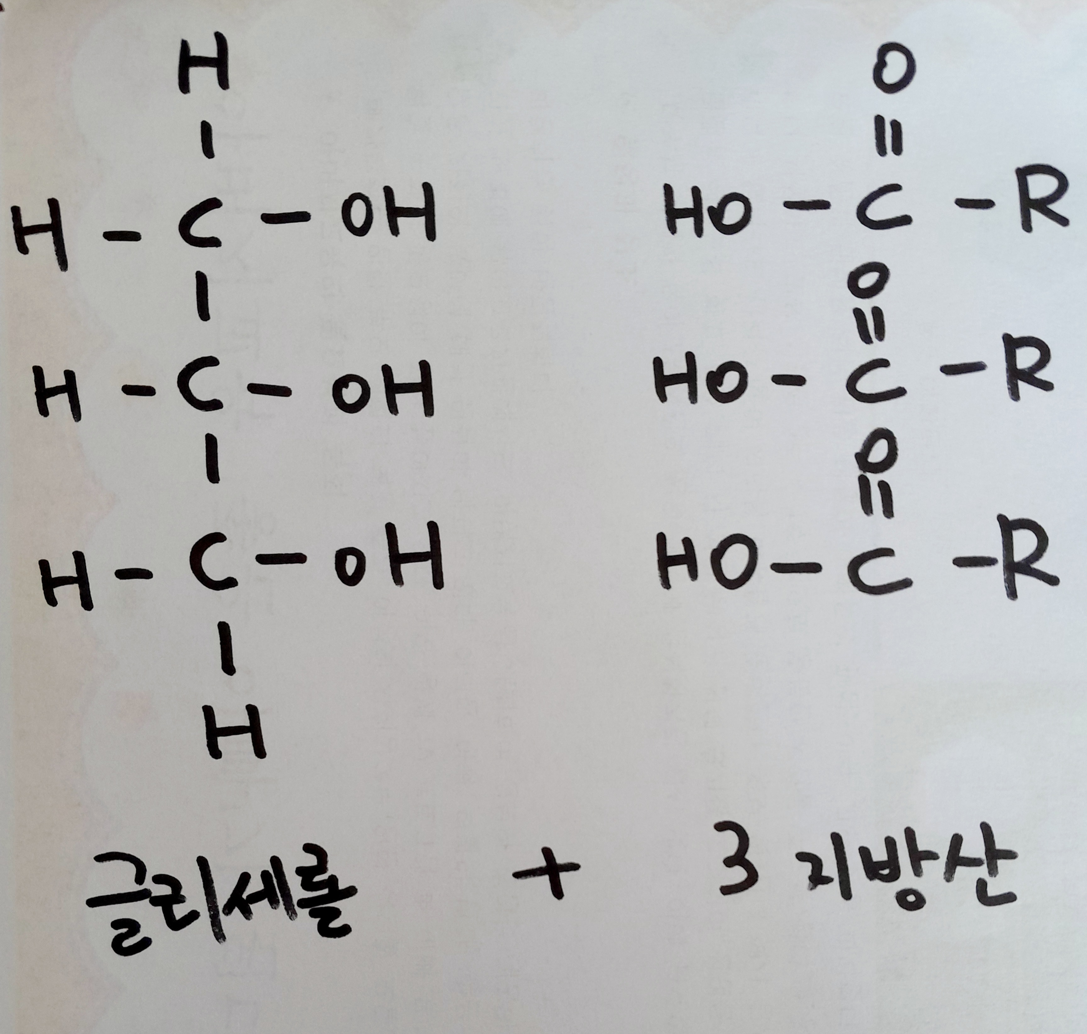 지방산의 카르복실기는 글리세롤의 수산기(-OH)와 에스테르 결합을 하여 모노아실글리세롤, 다이실글리세롤, 트리아실글리세롤을 형성합니다.