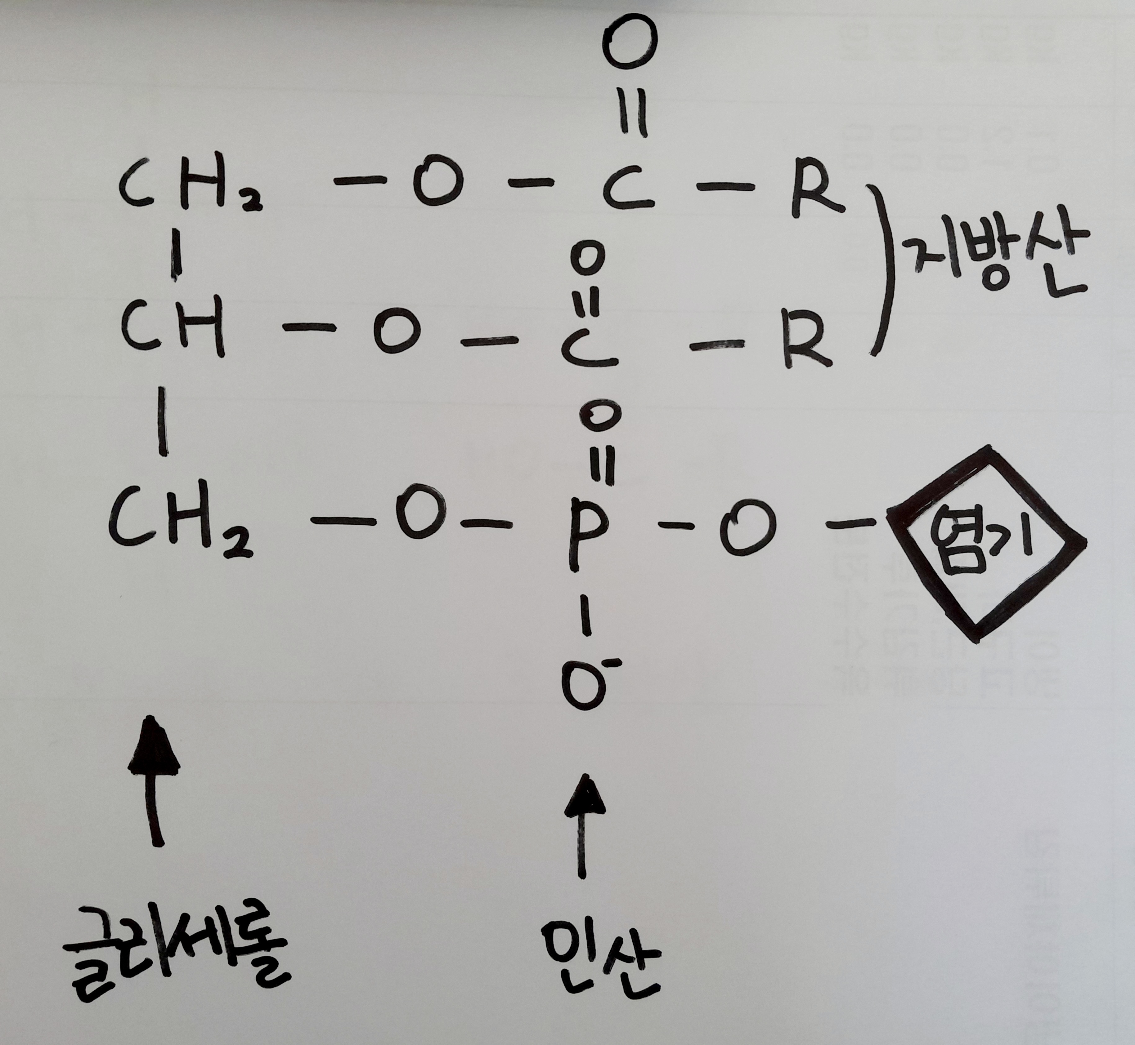 인지질은 중성지과 유사한 구조를 갖고 있으나 글리세롤의 3번째 수산기(-OH)에 지방산 대신 인산이 결합하며 여기에 염기가 연결되어 있습니다. 인지질은 세린, 에탄올아민, 콜린, 이노시톨 등의 염기에 따라 각각 포스파티딜세린, 포스파티딜에탄올아민, 포스파티딜콜린, 포스파티딜이노시톨로 불립니다. 포스파티딜콜린은 글리세롤과 지방산 2분자 인산, 세린의 결합으로 일반적으로 레시틴이라고도 부릅니다.