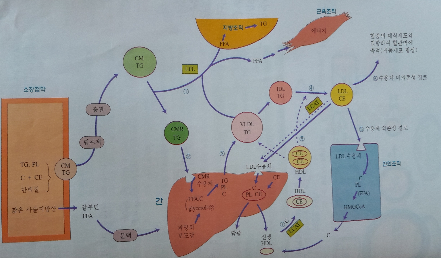 LDL는 혈액내에서 VLDL가 전환되며 생성됩니다. 콜레스테롤에스테르(CE)가 가장 많은 지단백입니다. LCAT 작용에 의해 HDL로부터 콜레스테롤에스테르(CE)를 받아서 조직으로 운반합니다.