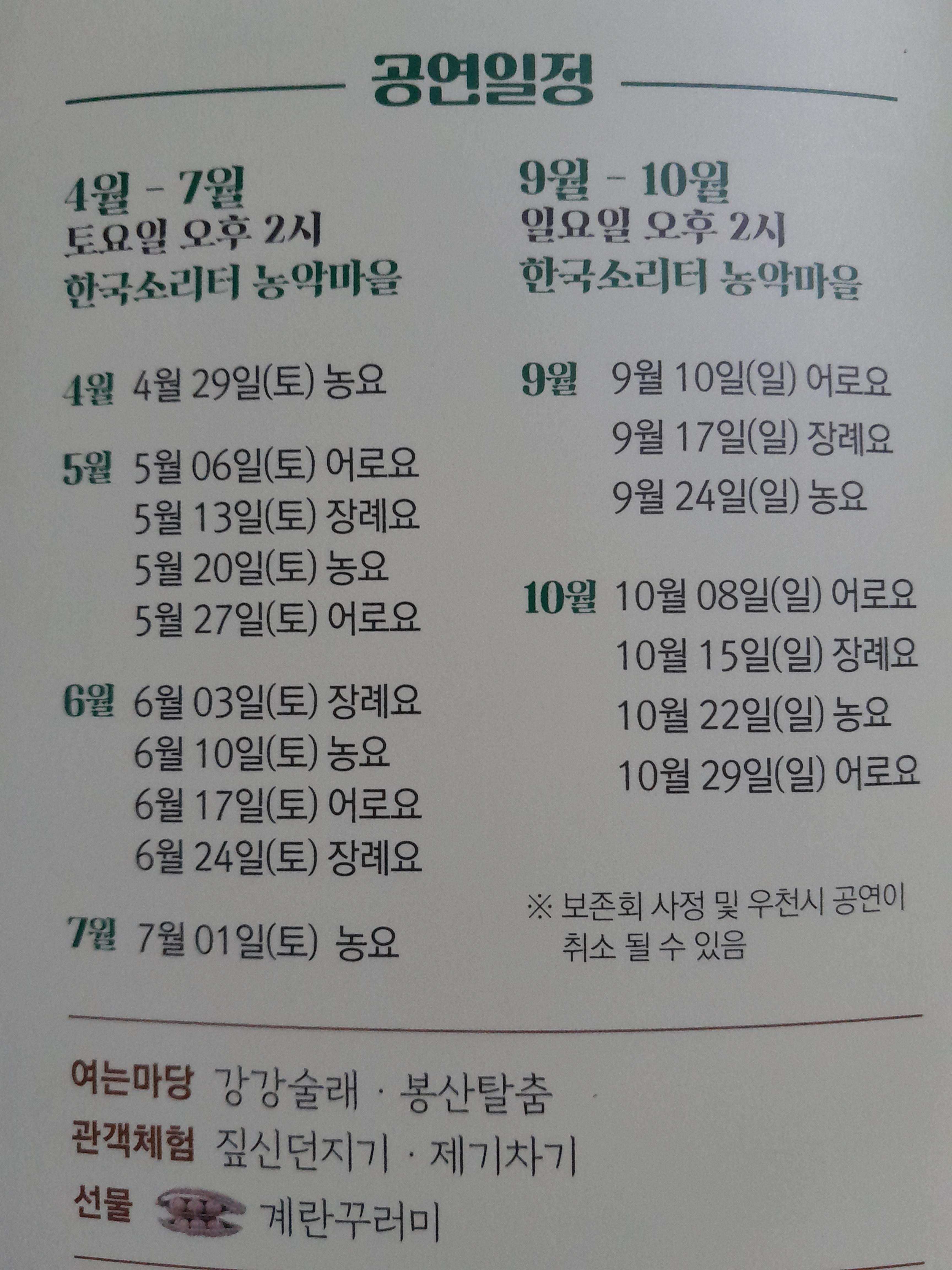 4월부터 7월까지는 토요일 오후 2시, 9월과 10월에는 일요일 오후 2시에 공연을 보실 수 있습니다.